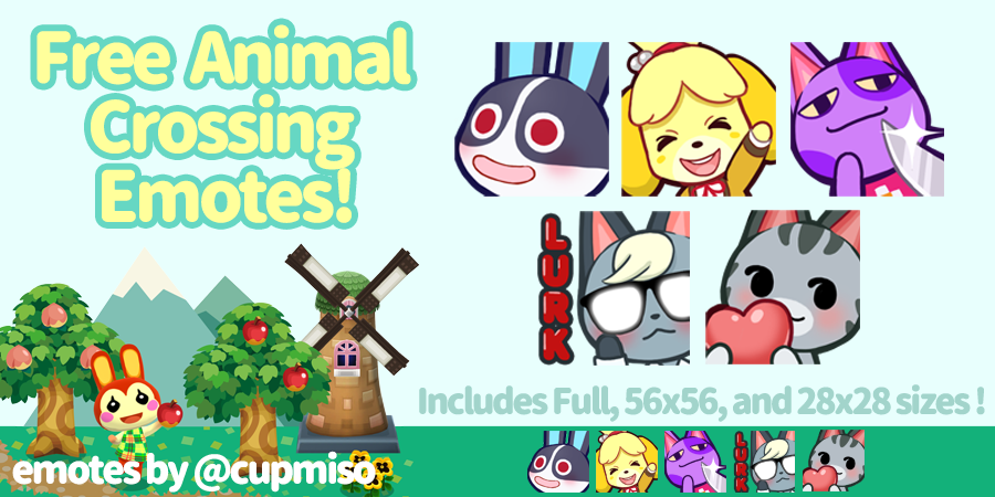 5 Free emotes for Twitch or Discord use! Featuring: Isabelle, Bob, Raymond, Dotty, and Lolly! These are free, but please consider crediting @cupmiso where used! Tips are not expected, but they are appreciated. ♡